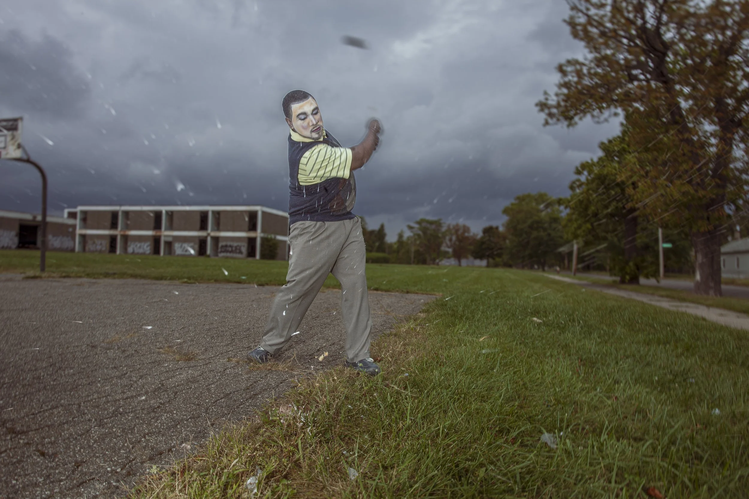 This series was created for a group show featuring artists from Detroit. It was inspired by two ideas: the wave of gentrification reshaping cities like Detroit, Brooklyn, and Atlanta, and the rise of “ruin porn” photography glorifying decay. I wanted to address how outsiders often depict Detroit’s “vibe” without any real connection to it. The images show a model golfing—a game tied to white, upper-class leisure—while wearing “white face” makeup, a satirical inversion of vaudevillian blackface. The juxtaposition of an African man in “white face” playing golf amid Detroit’s burnt-out east side reflects my critique of how people overlook the city’s vitality in favor of its decay and potential profit.